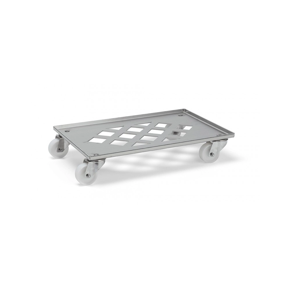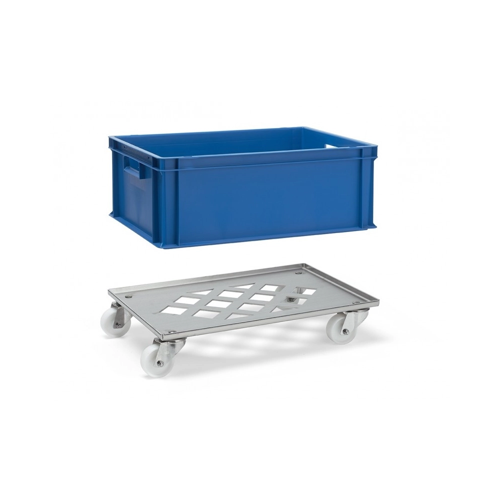 La base è progettata per facilitare il trasporto di cassette alimentari in modo efficiente e sicuro. Il fondo a griglia rinforzata assicura una distribuzione uniforme del carico, mantenendo stabilità anche in presenza di pesi elevati. La configurazione a corpo unico aumenta la solidità complessiva e riduce i punti critici soggetti a usura. Le quattro ruote pivotanti, realizzate con supporto in acciaio inox e battistrada in nylon, permettono una movimentazione fluida, facilitando gli spostamenti anche in spazi operativi intensi.