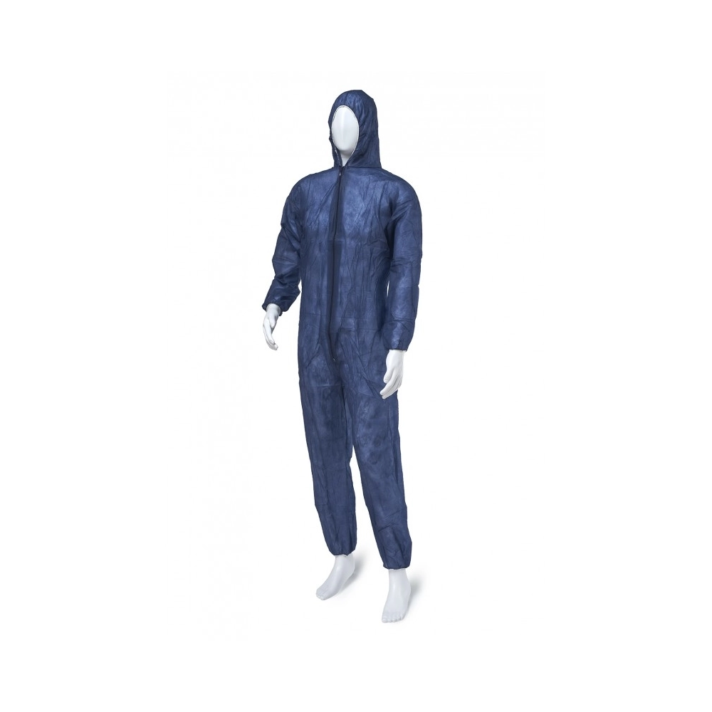 Tuta monouso blu con cappuccio, realizzata in TNT (tessuto non tessuto) in polipropilene da 40 g/m².