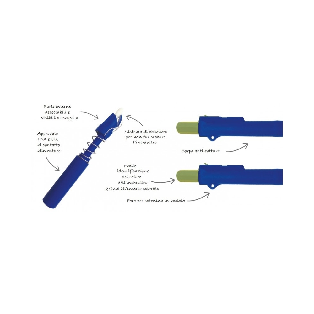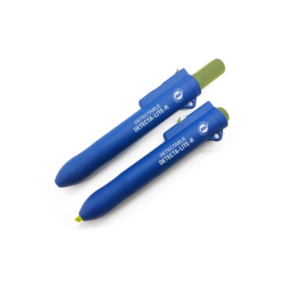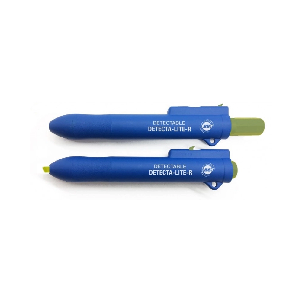 Evidenziatore retrattile senza tappo, progettato per l'utilizzo in ambienti ad alta igiene. Il corpo in materiale detectabile al metal detector e visibile ai raggi X è studiato per minimizzare il rischio di contaminazione da corpi estranei.