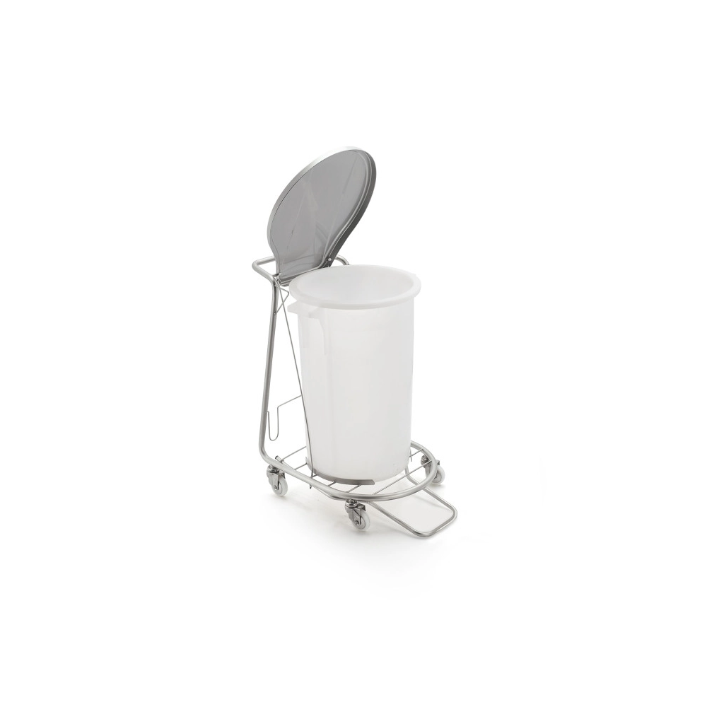 Costruito con struttura, coperchio e pedale in acciaio inox AISI 304, garantisce un’elevata resistenza alla corrosione e una lunga durata anche in contesti sottoposti a frequenti lavaggi e sanificazioni. Il telaio con finitura a pallinatura antimacchia rende il carrello facile da pulire e ne migliora l’aspetto estetico.