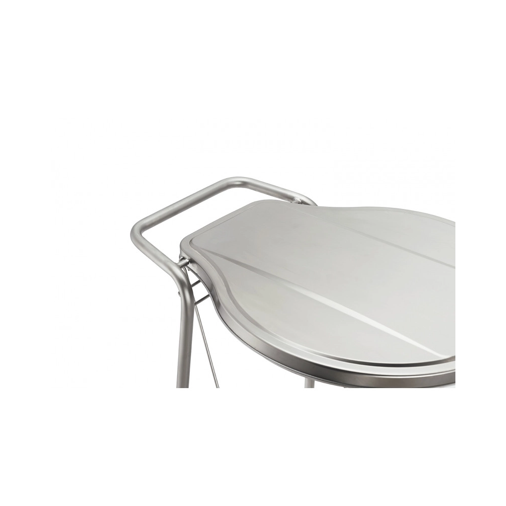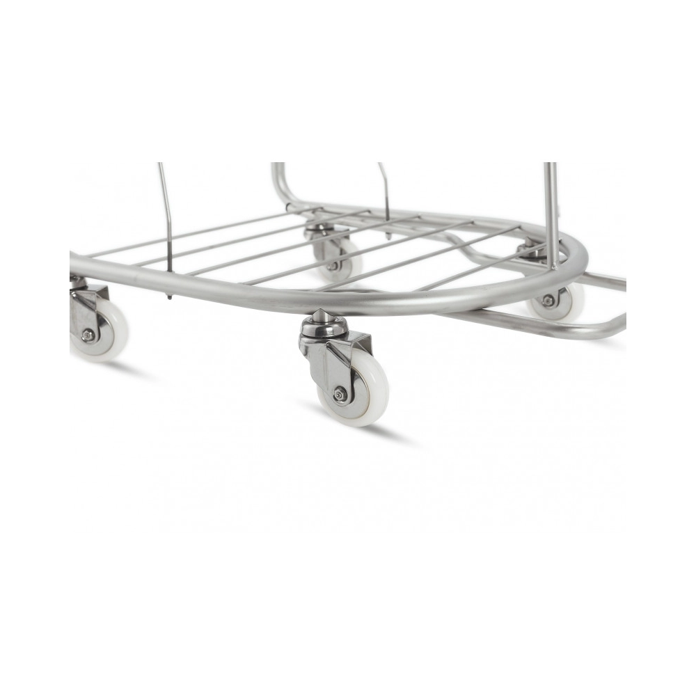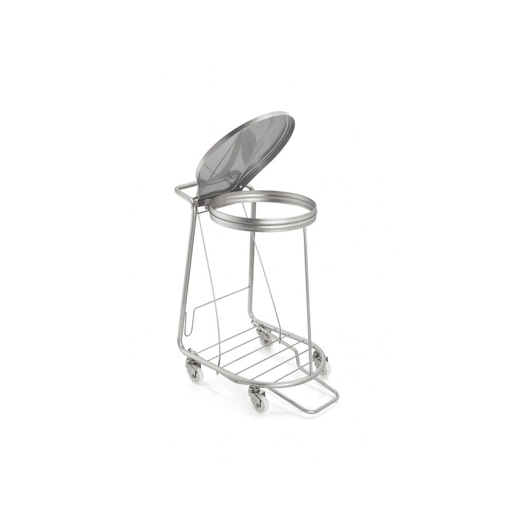 Il telaio rifinito con pallinatura antimacchia dona al carrello una finitura opaca elegante, che ne facilita la pulizia e ne aumenta la resistenza all’usura e alla corrosione. L’apertura del coperchio avviene tramite pedale in acciaio inox, che consente un utilizzo pratico e igienico senza il contatto diretto con le mani.