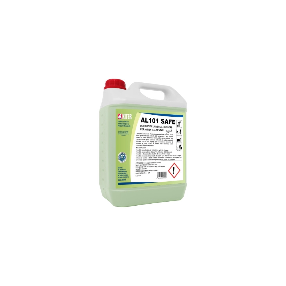AL 101 SAFE ਠun detergente concentrato d'impiego generale, a media alcalinità (pH=11) formulato per la pulizia giornaliera degli ambienti, attrezzature e impianti delle aziende alimentari (sistema HACCP).