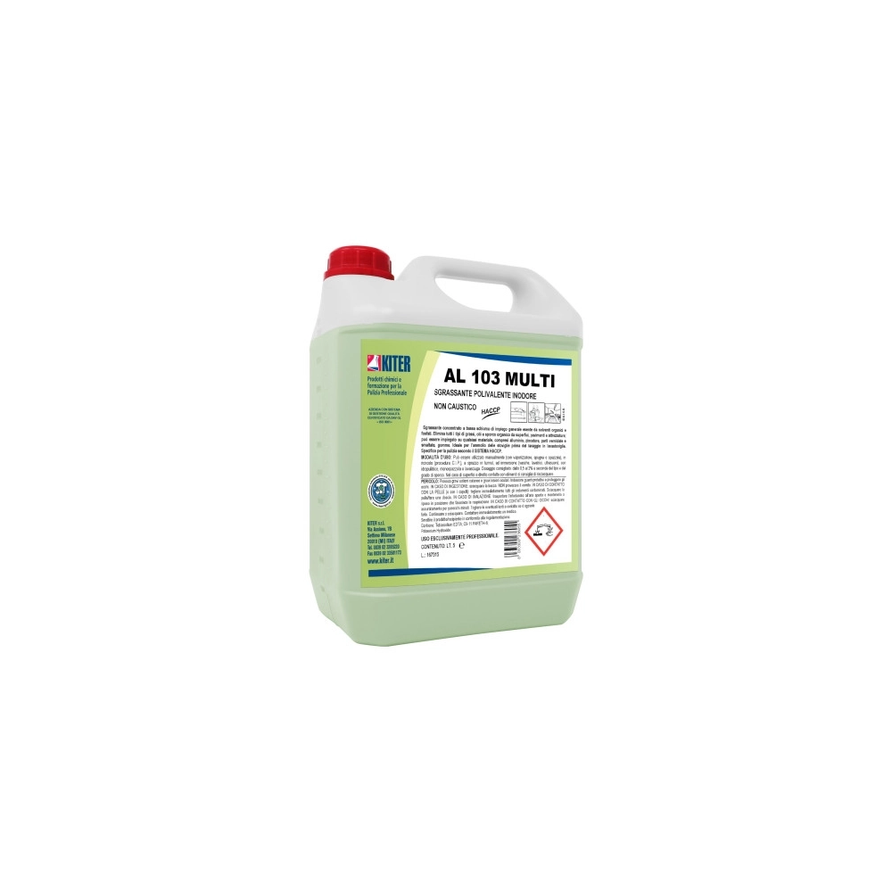 AL 103 MULTI è uno sgrassante concentrato di impiego generale con elevato potere pulente ed emulsionante dello sporco grasso, esente da solventi organici, fosfati e nonilfenoli.