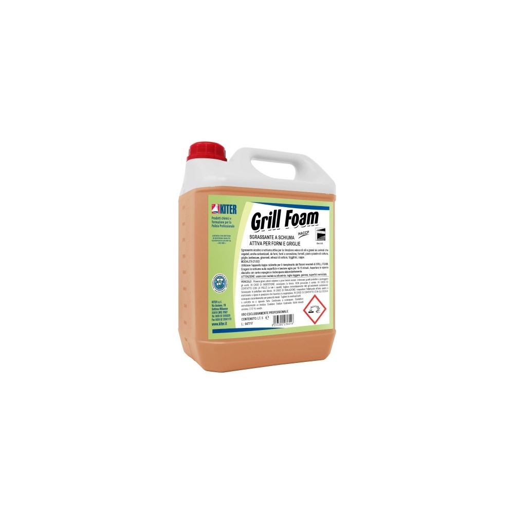 GRILL FOAM è uno sgrassante alcalino di uso professionale a schiuma attiva per la rimozione veloce di olii e grassi sia animali che vegetali, anche carbonizzati, specifici degli ambienti HACCP.