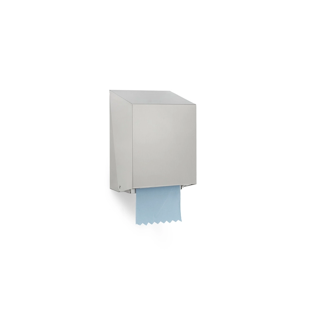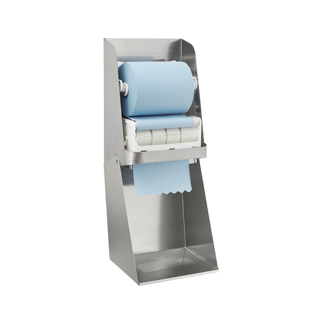 Il tetto inclinato a 60° impedisce l’accumulo di polvere e l’appoggio di oggetti, mentre la chiusura ad incastro (senza chiavi o viti) consente una manutenzione semplice e sicura. Il dispositivo è predisposto con fori per il fissaggio a muro. La struttura interna supporta rotoli con diametro di 40 mm.