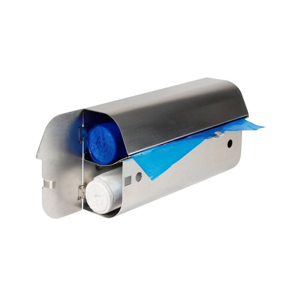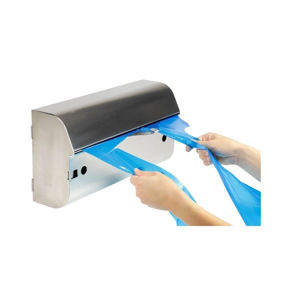 Dispenser in acciaio inox AISI 304 per grembiuli in rotolo, progettato per garantire praticità e ordine nelle aree di vestizione.