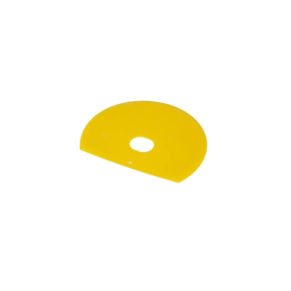 Spatola a mezzaluna realizzata in plastica alimentare, dotata di foro sull’impugnatura per facilitarne l’affissione e la conservazione in ambienti professionali.