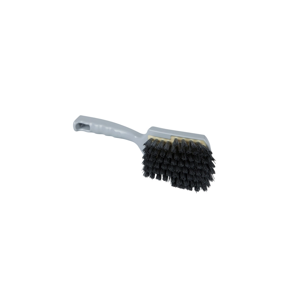 Spazzola resinata con manico corto e setole medie, progettata per garantire la massima igiene nelle operazioni di pulizia manuale.
