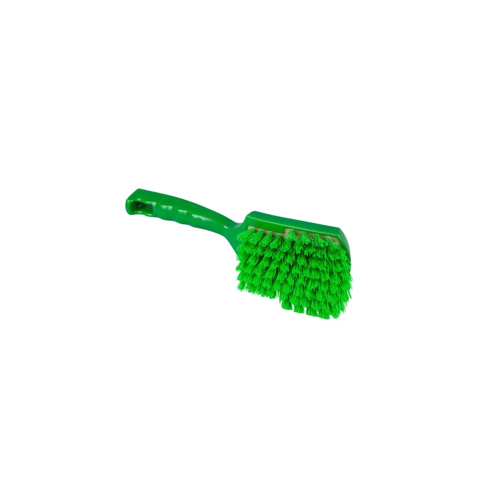 Spazzola resinata con manico corto e setole medie, progettata per garantire la massima igiene nelle operazioni di pulizia manuale.